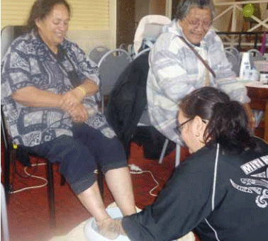 treats Whaea Pat Fenton to a foot massage, while Whaea Hazel Kingi